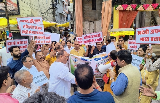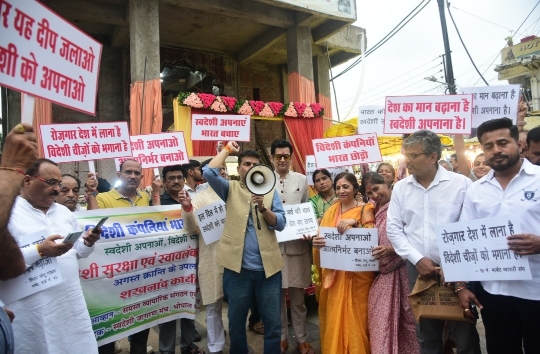 भोपाल — स्वदेशी जागरण मंच ने रविवार को "स्वदेशी, सुरक्षा एवं स्वावलंबन अभियान" के अंतर्गत न्यू मार्केट में विदेशी कंपनियों को भारत छोड़ने तथा अमेरिका द्वारा भारत पर लगाए गए टैरिफ के खिलाफ जोरदार विरोध प्रदर्शन किया। इस अवसर पर जनजागरण रैली निकाली गई और उपस्थित नागरिकों ने स्वदेशी अपनाने का संकल्प लिया।