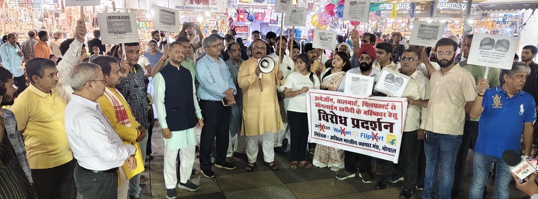 भोपाल के प्रमुख व्यापारिक क्षेत्र न्यू मार्केट में आज अखिल भारतीय व्यापार मंच एवं न्यू मार्केट व्यापारी संघ के संयुक्त तत्वावधान में अमेज़ॉन, वॉलमार्ट, और फ्लिपकार्ट जैसी विदेशी ऑनलाइन कंपनियों के विरुद्ध एक जोरदार विरोध प्रदर्शन एवं जागरूकता यात्रा निकाली गई। इस अभियान का उद्देश्य स्थानीय ग्राहकों को स्वदेशी वस्तुओं की ओर प्रेरित करना और उन्हें ऑनलाइन खरीदारी की अपेक्षा स्थानीय दुकानदारों से ही खरीददारी करने हेतु जागरूक करना था।